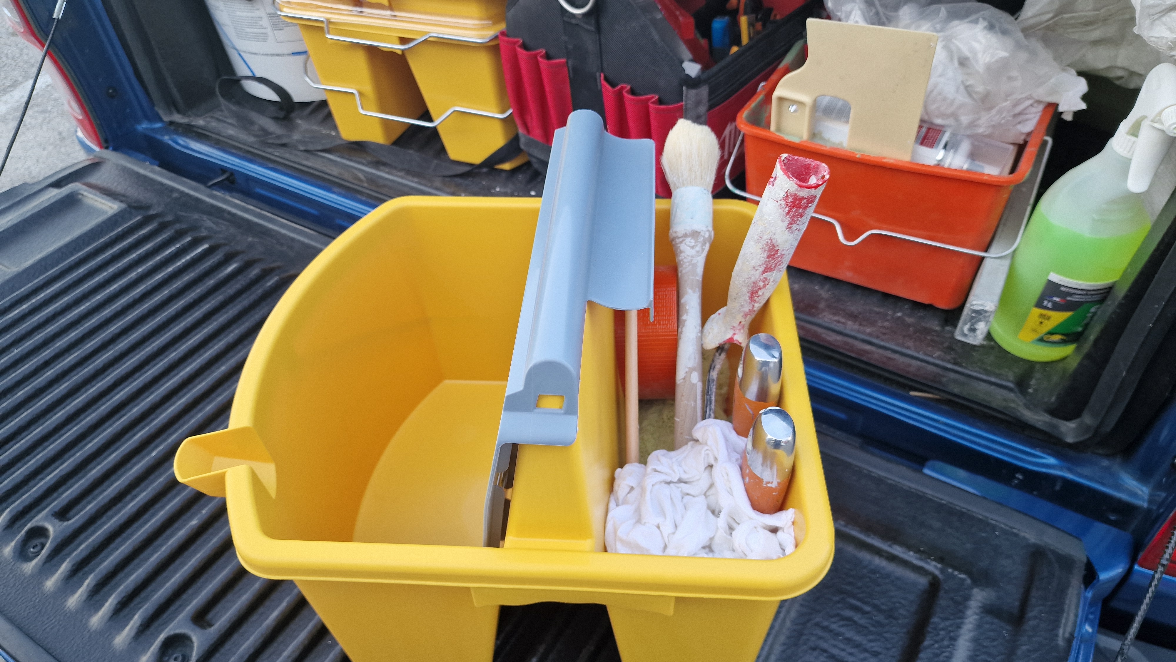 Le deuxième bac sert à placer vos outils pour vous rendre sur le chantier : rouleaux, pinceaux, couteaux, chiffons, mètres, scotch et divers accessoires (voir ici)